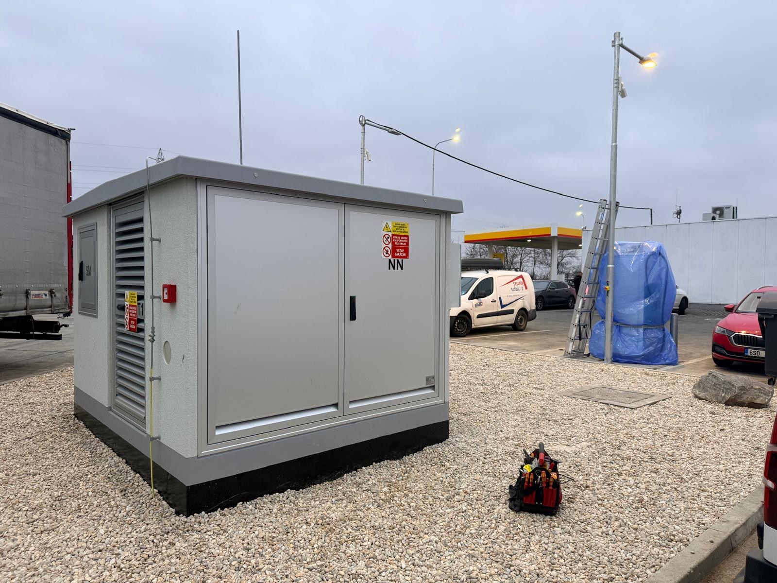 Na čerpací stanici SHELL Ladná jsme úspěšně dokončili projekt zaměřený na rozvoj infrastruktury pro elektromobilitu. Součástí zakázky byla dodávka a kompletní montáž trafostanice, která bude sloužit jako hlavní napájecí prvek pro budoucí rychlonabíjecí stanice.